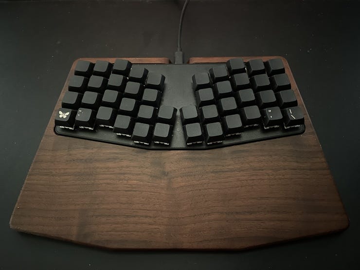 My favourite keyboards right now are the Keyboardio Atreus in its walnut enclosure, in Colemak configuration with blank keycaps sat atop Kailh Pink switches. It's wired, but it's by far the most comfortable keyboard I've ever used. I also use the Ergodox EZ Planck, two of them in fact, with Kailh Gold switches. All of these keyboards are set up to use Colemak.